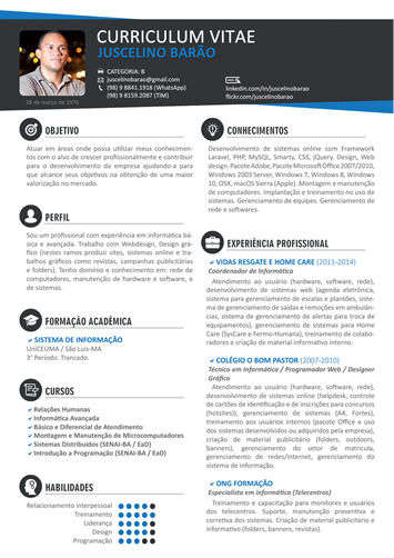 Solicitei que meu currículo fosse refeito e para minha surpresa... ficou ótimo! Recomendo pelo capricho, rapidez e eficiência. Parabéns Juscelino Barão.